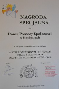 W dniu 27 stycznia 2018r. Nasz panie wzięły udział w XXIV Powiatowym Festiwalu Kolęd i Pastorałek- w Złotnikach Kujawskich- KOPA 2018r. Jak każdego roku Panie zaprezentowały wokalnie- zaśpiewały przepiękne kolędy oraz na zajęciach w pracownii terapii zajęciowej przygotowały Szopkę Bożonarodzeniową- w tym roku w wersji ekologicznej. Szopka została wyróżniona Nagrodą Specjalna.