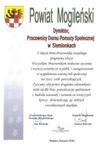 Rok 2018 zajmuje szczególne miejsce w sercach polaków. W tym roku na terenie całego kraju odbywały się liczne uroczystości upamiętniające 100 lecie odzyskania przez Polskę Niepodległości. Tradycją jest też, że Nasze Panie obchodzą dzień 11 listopada. Dnia 14 listopada w Naszym Domu odbyło się przedstawienie o tematyce narodowo- wyzwoleńczej w wykonaniu Naszych Pań. W tym także dniu gościliśmy u nas Starostę Powiatu Mogileńskiego- Pana Tomasza Barczaka, wicestarostę- Pana Krzysztofa Szarzyńskiego, przedstawiciela Zarządu Powiatu- Pana Marka Maruszaka, Przewodniczącego Rady Powiatu- Pana Jana Barteckiego oraz Panią Skarbnik Powiatu- Panią Karinę Kostyra. W tym dniu Starosta Powiatu- Pan Tomasz Barczak na ręce Dyrektora Domu – Pana Adama Tomaszewskiego złożył serdeczne życzenia oraz kwiaty z okazji zbliżającego się Dnia Pracownika Socjalnego. Fotorelacja…
