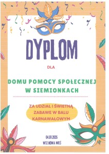 W dniu 4 marca 2025r. Nasze Panie wraz z opiekunem i Dyrektorem Domu-Panem Adamem Tomaszewskim brały udział w Balu Karnawałowym w WTZ w Nowej Wsi. Bal był pełen magii i fantastycznej zabawy! 🎉 Uczestnicy mieli okazję poczuć się jak gwiazdy dzięki fotobudce 360 , zapozować na specjalnej ściance do zdjęć, a także wziąć udział w emocjonującym konkursie na króla i królową balu .